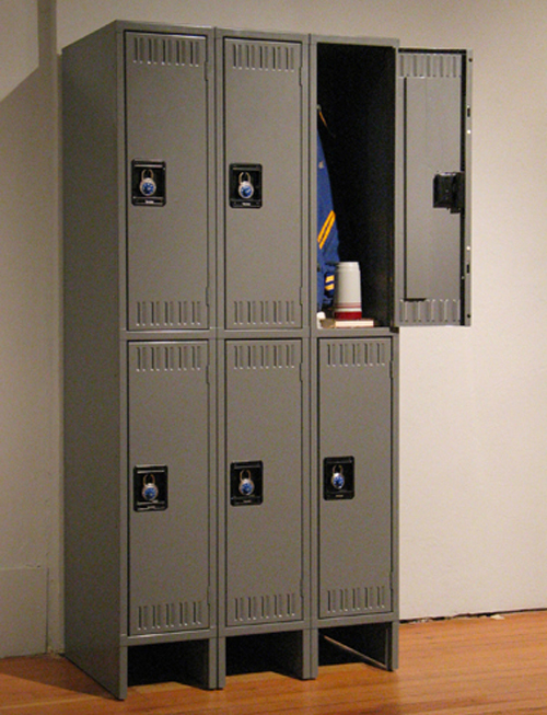 MDO, Wood, acrylic paint, metal doors, padlocks, hardware, letter jacket, books, thermos, metal miniature, enamel, lighting, and batteries.