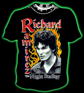 This death black shirt features Satanic Serial Killer-RICHARD RAMIREZ, the dreaded Night Stalker who terrorized the whole state of California in the 1980's! The print on this midnight black tee is HUGE-it takes up the entire front of the Tee-engulfing you in pure evil imagery! The picture is of a scowling Richard glowing in the flames of HELL! Now look close and you see some of the flames make the numbers 666. Now its hard to see here on this eBay scanned photo but placed in Richard's eyes are BLOOD RED pentagrams that push this design completely over the edge! Also gaze down, if you dare, and you'll spot a hidden pentagram on Richard shirt!