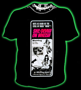 and a decapitation, a winning combination if I've ever heard of one! Director HG Lewis used some actual female bikers of the day as supporting cast members to give it that extra touch of realism! If you havenÕt seen this film yet I would highly recommend it, its alot of fun! Printed in white and hot pink ink on this biker black T-shirt is a repro of one of the original advertisments for the film. It features Queenie, the leader of the gang, lounging seductively on her "Hog"! Above her is a picture of one of the infamous man-eater orgy scenes, all of which is surrounded by the advertising movie hype! This shirt is as much fun as the movie is!